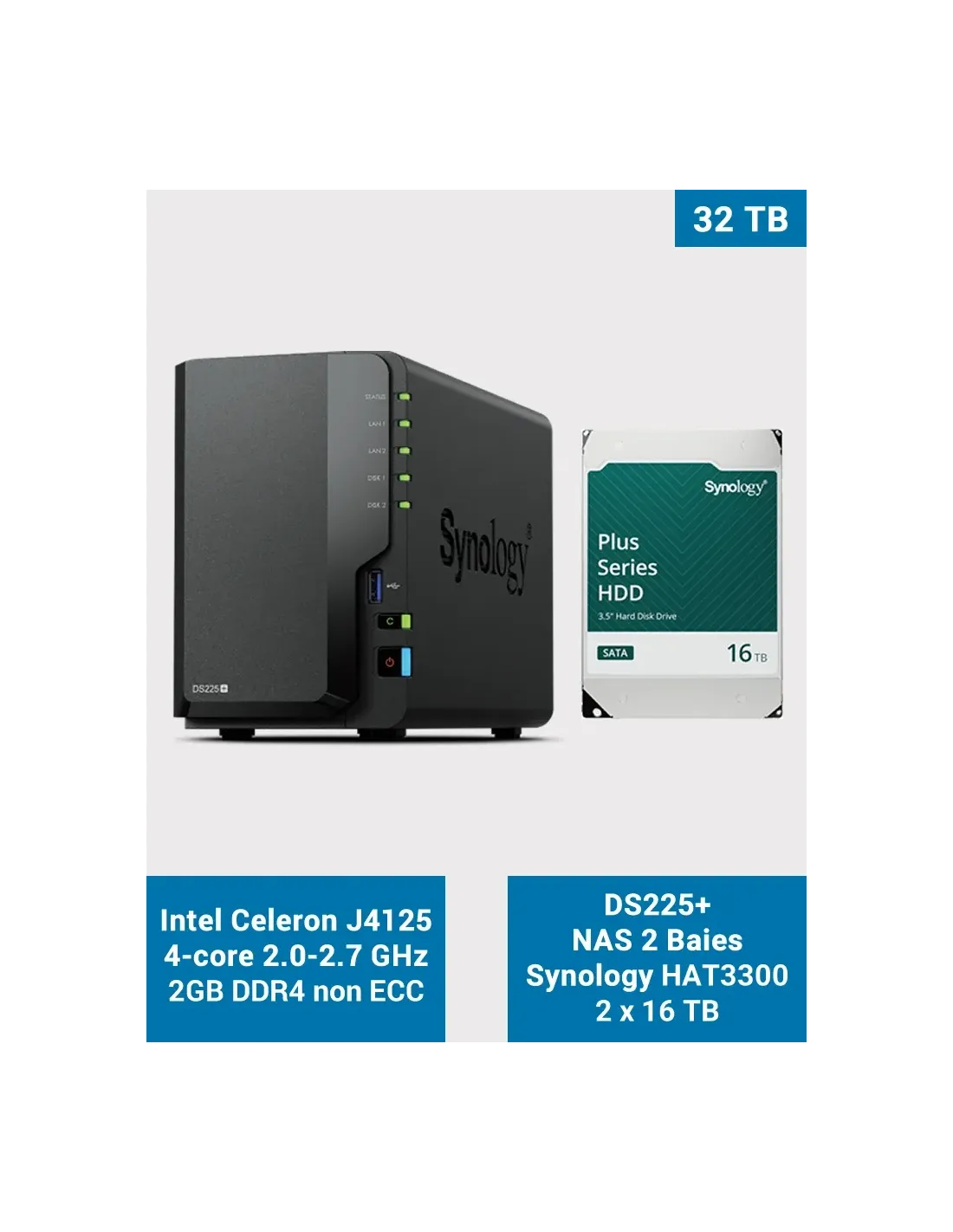 Synology DS225+ – NAS de 2 bahías con 2 × HAT3300 16 TB (32 TB)