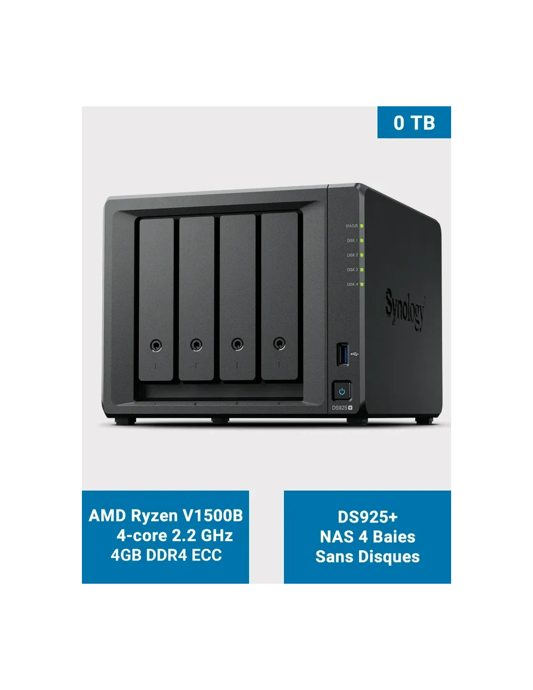 El Synology DS925+ es un NAS profesional de 4 bahías (sin discos), diseñado para pymes, departamentos IT y entornos exigentes. Incorpora un procesador AMD Ryzen V1500B (4 núcleos / 8 hilos a 2,2 GHz) y 4 GB de RAM DDR4 ECC, ampliables hasta 32 GB. Gracias a su diseño compacto y escalable, puede alojar hasta 9 discos con la unidad de expansión Synology DX525 (opcional).