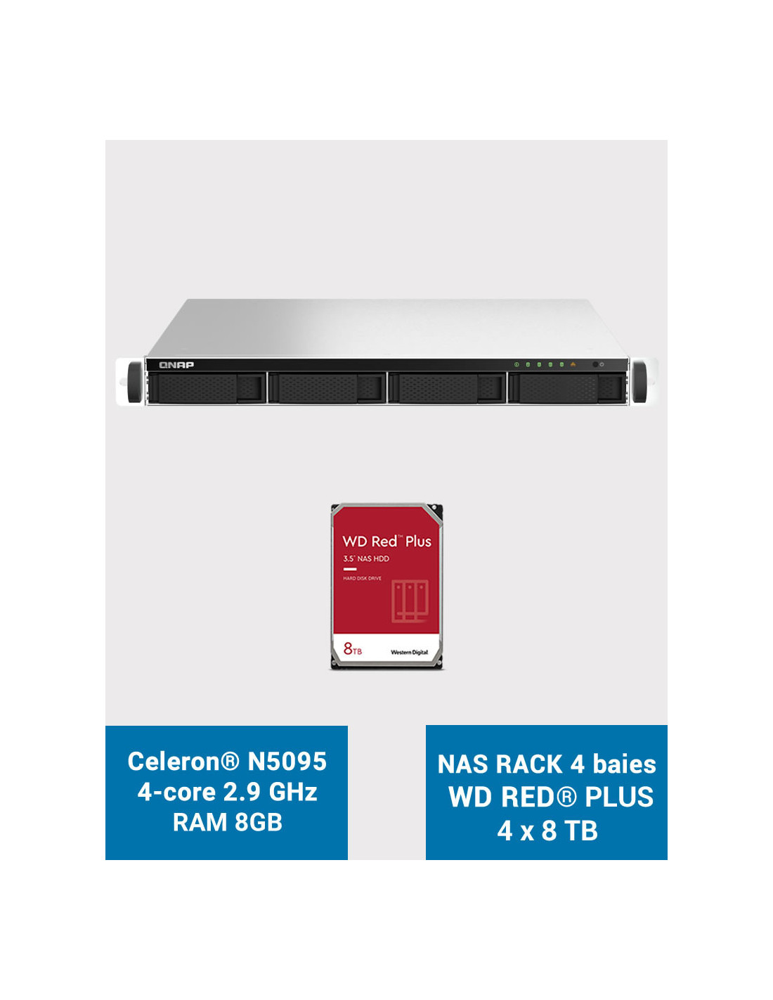 QNAP TS-464U 8GB Serveur NAS Rack 1U 4 baies WD RED PLUS 32To (4x8To)