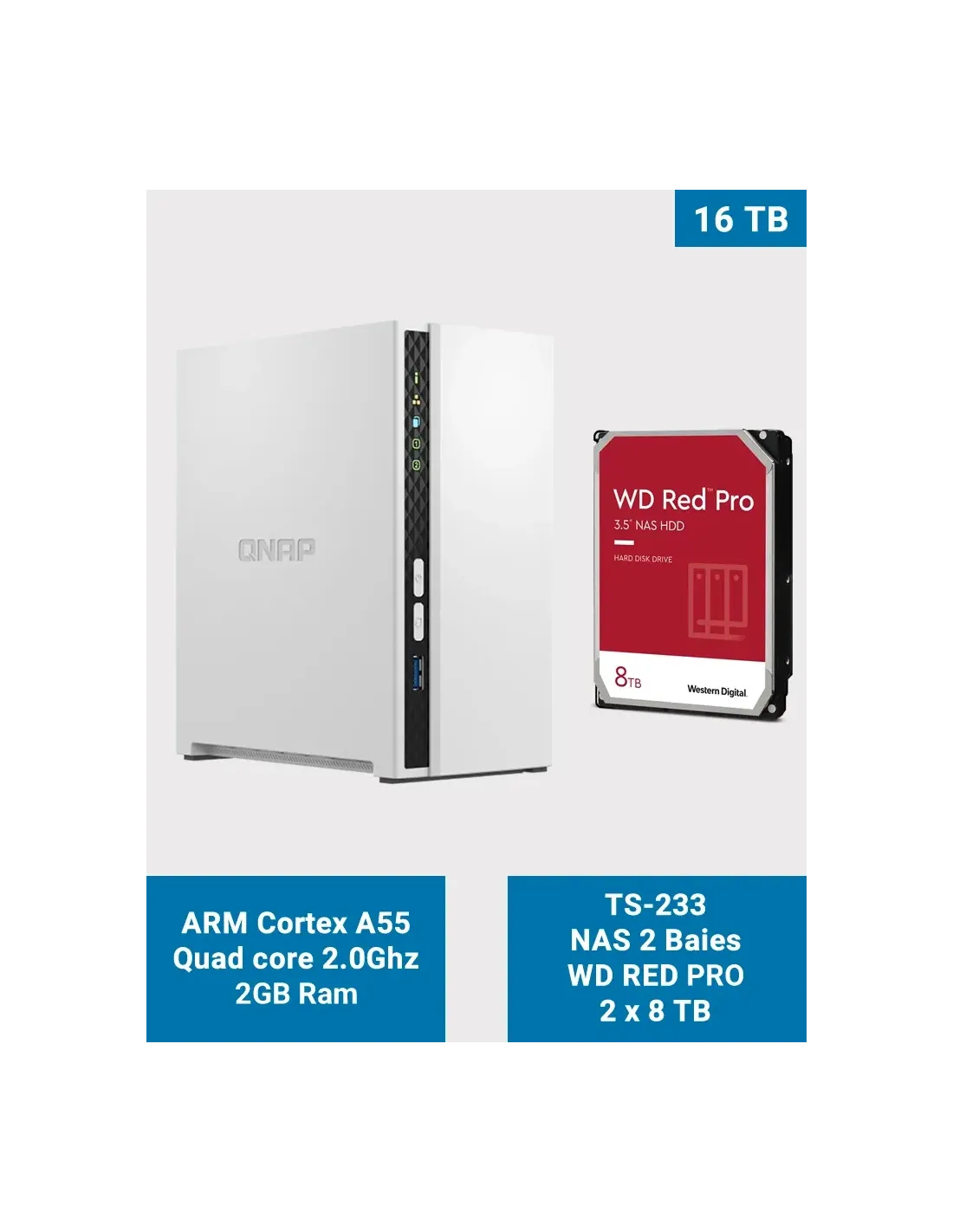 Cette version est livrée avec 2 disques WD Red Pro 8 To CMR (WD8003FFBX), certifiés NASware 3.0 et conçus pour un usage NAS intensif 24 h/24 – 7 j/7.