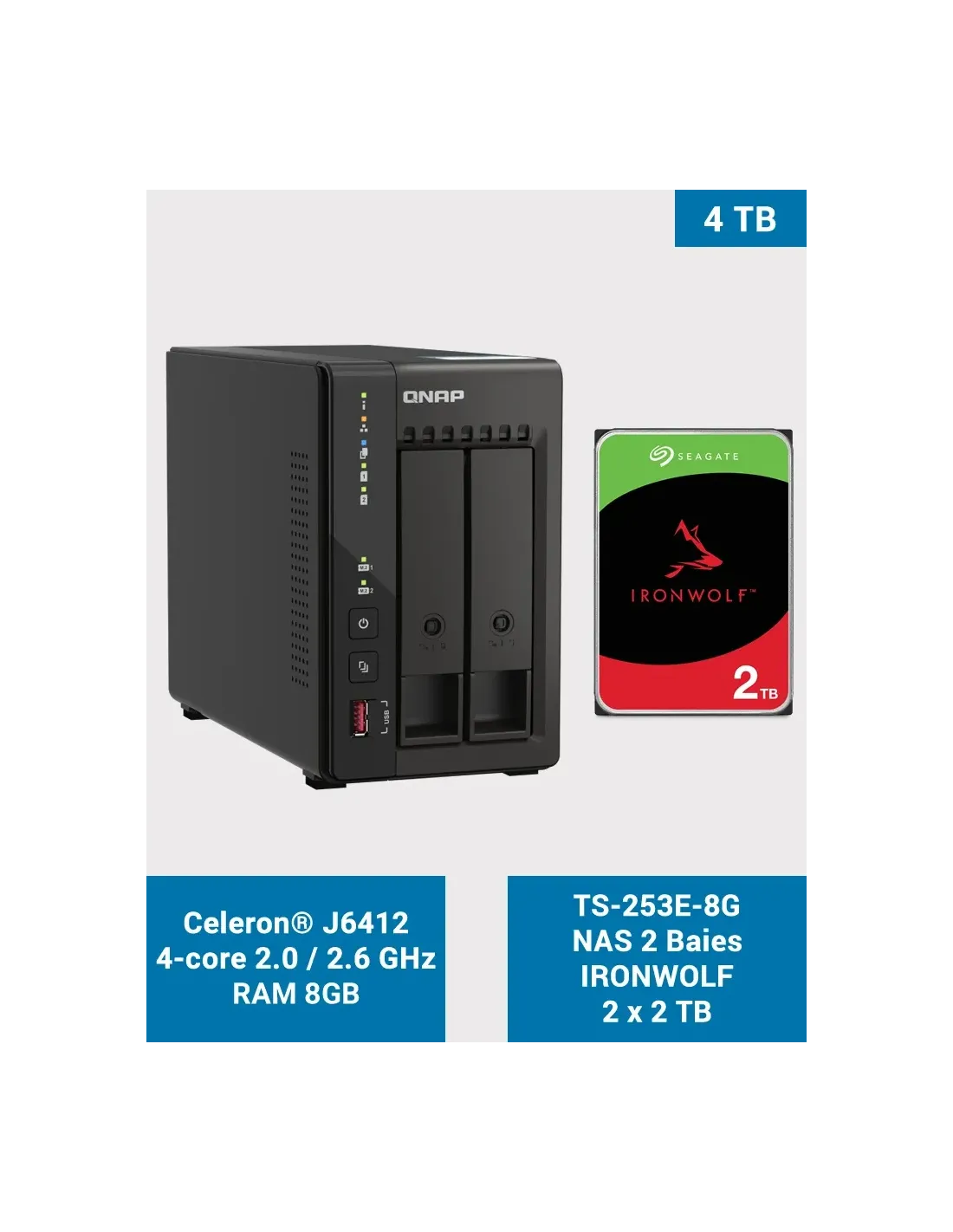 QNAP TS-253E-8G avec 2× Seagate IronWolf 2 To – NAS 2 baies pré-équipé, 8 Go RAM, 2× 2.5 GbE, NVMe, HDMI 4K