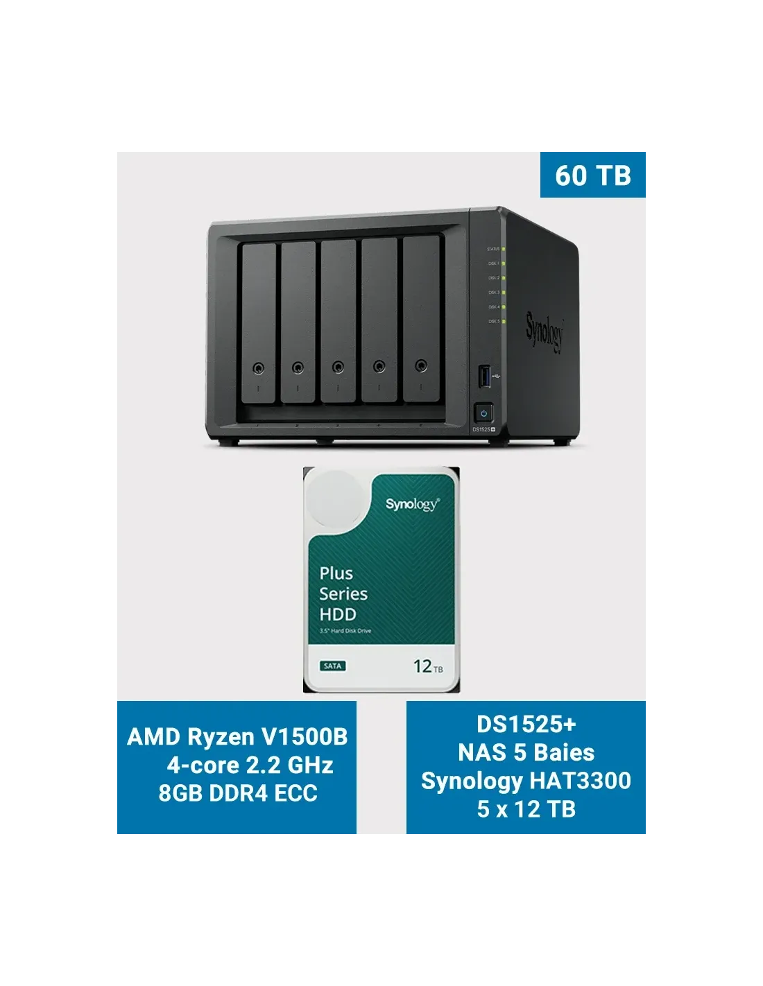 Synology DS1525+ NAS 5 baies 60 To avec 5 disques Synology HAT3300 12To