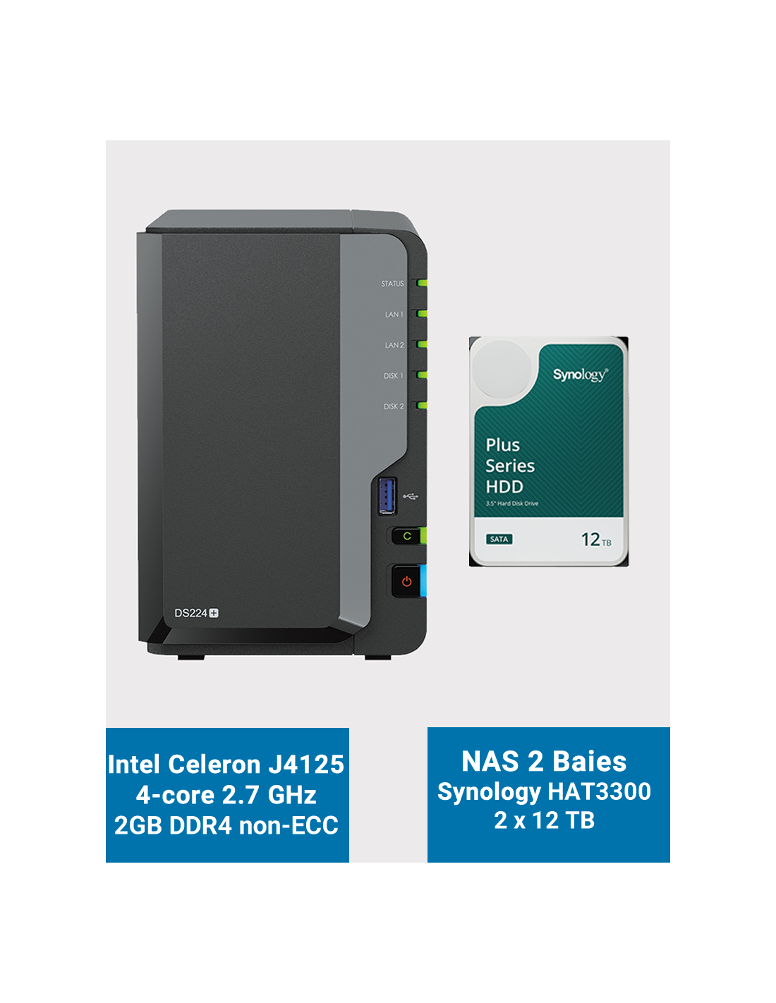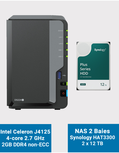 Synology DiskStation DS224+ 2Go Serveur NAS HAT3300 24To (2x12To)