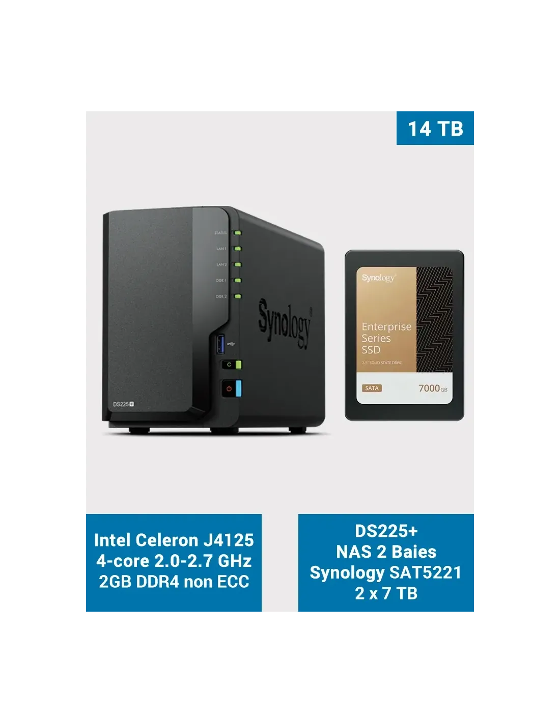 Le Synology DS225+ est un NAS 2 baies livré avec 2 SSD Synology SAT5210-7000G, pour une capacité totale de 14 To bruts.