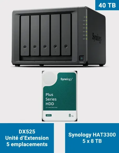 Le Synology DX525 avec 5 disques HAT3300 de 8 To offre une extension de 40 To pour votre NAS Synology. Connexion USB-C, gestion DSM, installation à chaud et garantie 3 ans Synology.