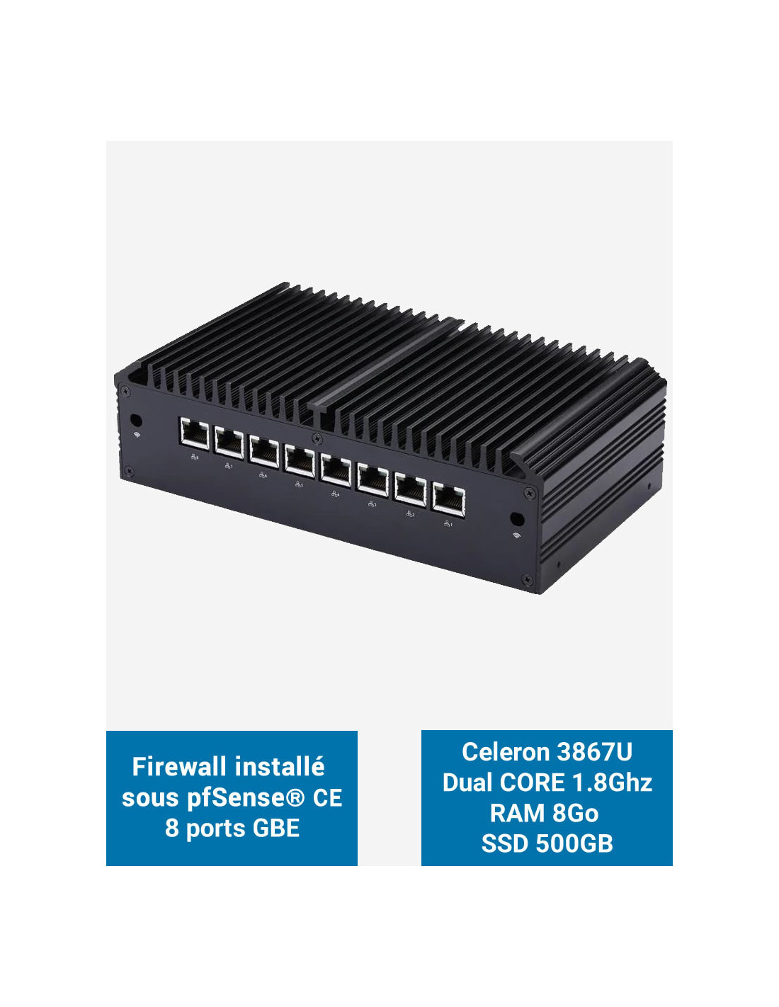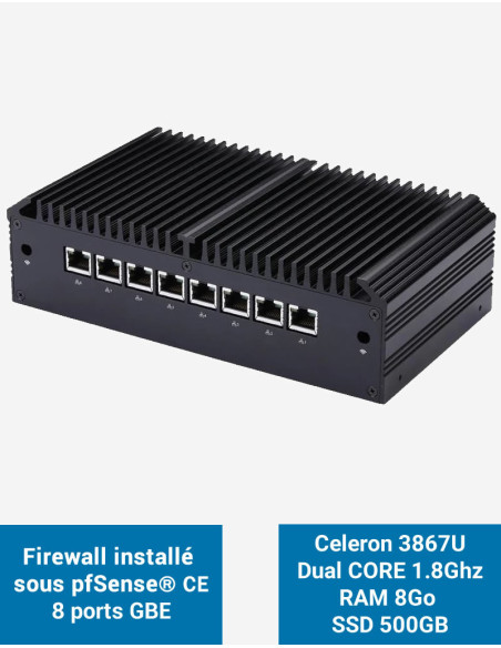 Firewall Q8x pfSense Celeron 3867U 8 ports GbE 8GB 500GB