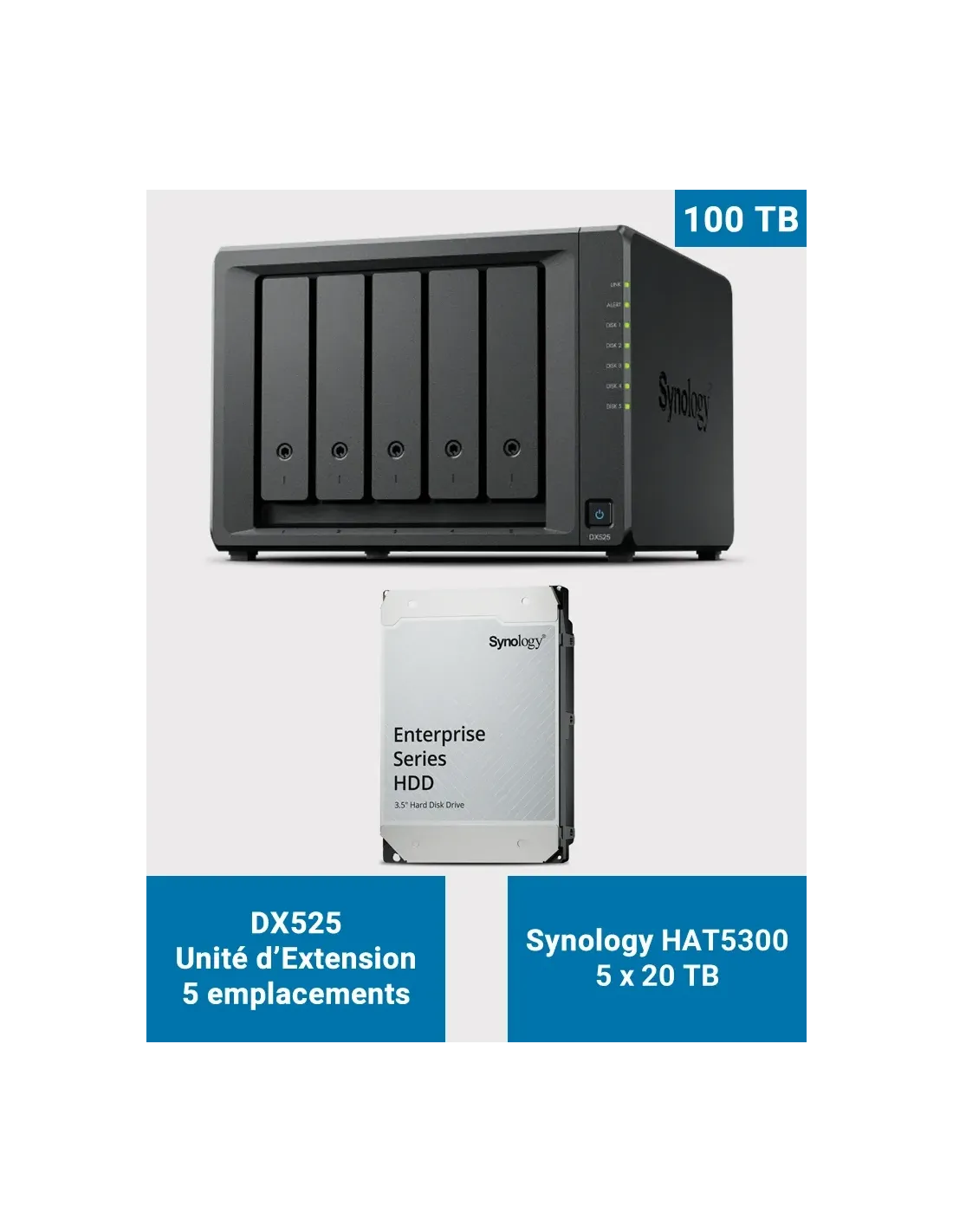 The Synology DX525 is a 5-bay expansion unit equipped with 5 Synology HAT5300 20 TB drives, providing 100 TB of raw capacity for compatible NAS systems.
