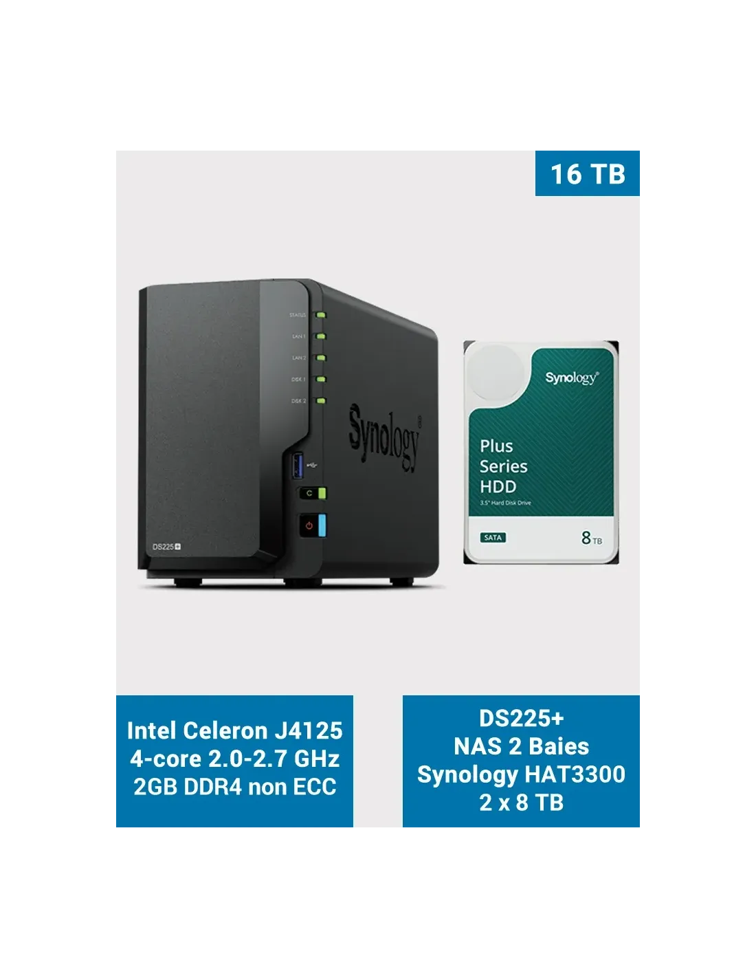 The Synology DS225+ is a compact 2-bay NAS, delivered with 2 Synology HAT3300 8 TB drives, offering a total raw capacity of 16 TB.