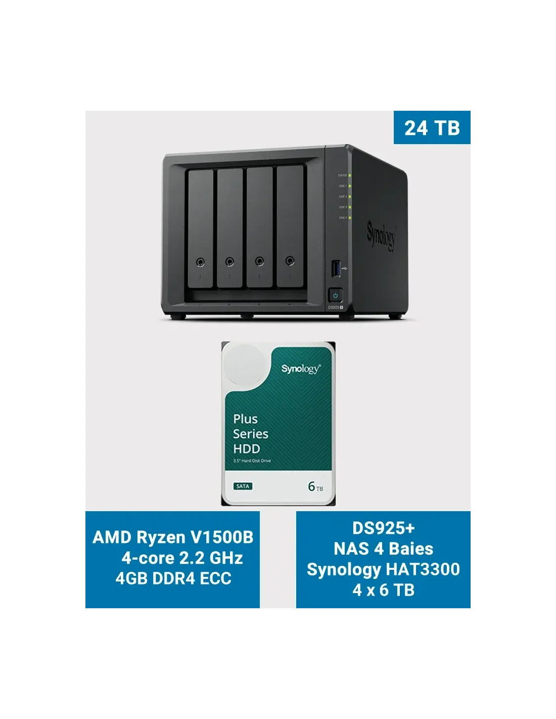The Synology DS925+ is a compact professional 4-bay NAS, delivered with 4 preinstalled 6 TB Synology HAT3300 drives (total raw capacity: 24 TB). Ideal for businesses needing reliable storage, multi-user backup and local hosting.